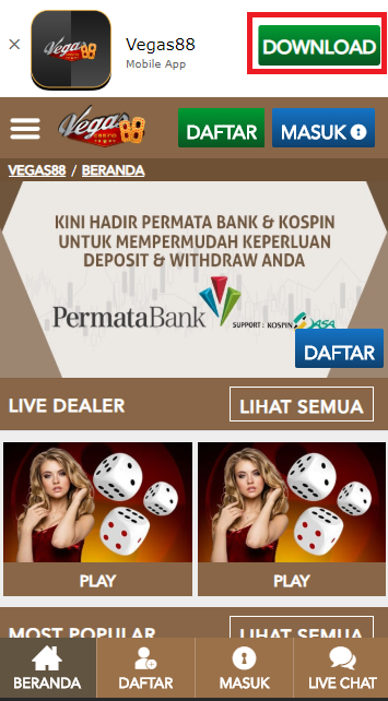 1. Masuk ke menu Browser Mobile anda dan Kunjungi Vegas88 setelah itu klik menu MOBILE lalu klik button Download Now, dan tunggu proses download selesai.